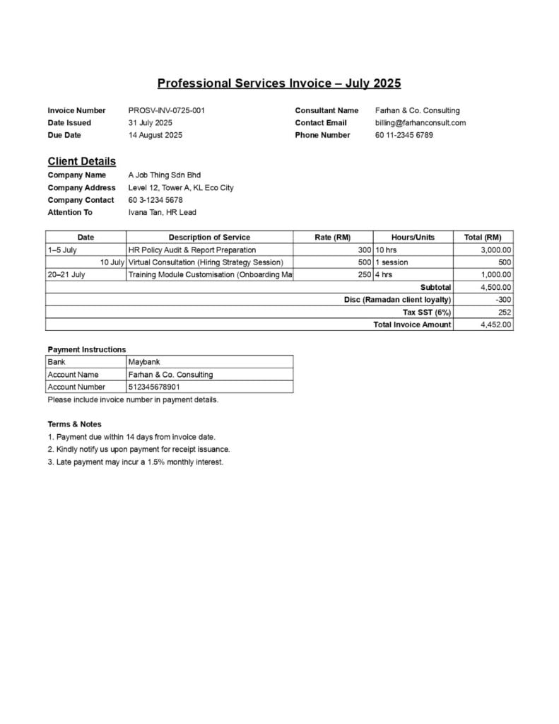 The billing structure should also be evident, whether the charges are hourly, fixed-fee, milestone-based, or recurring. Clear alignment between the service period and billing method improves transparency and reduces follow-up queries.